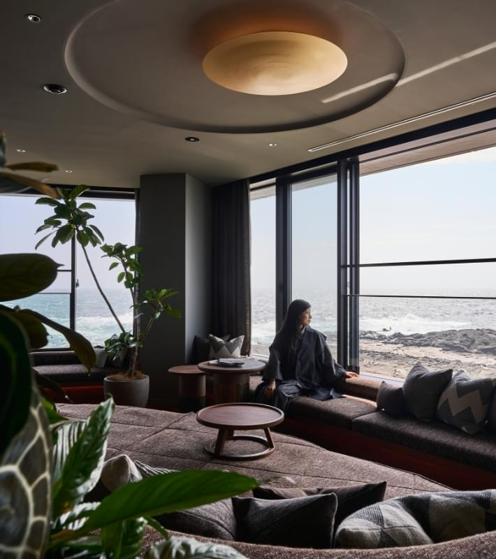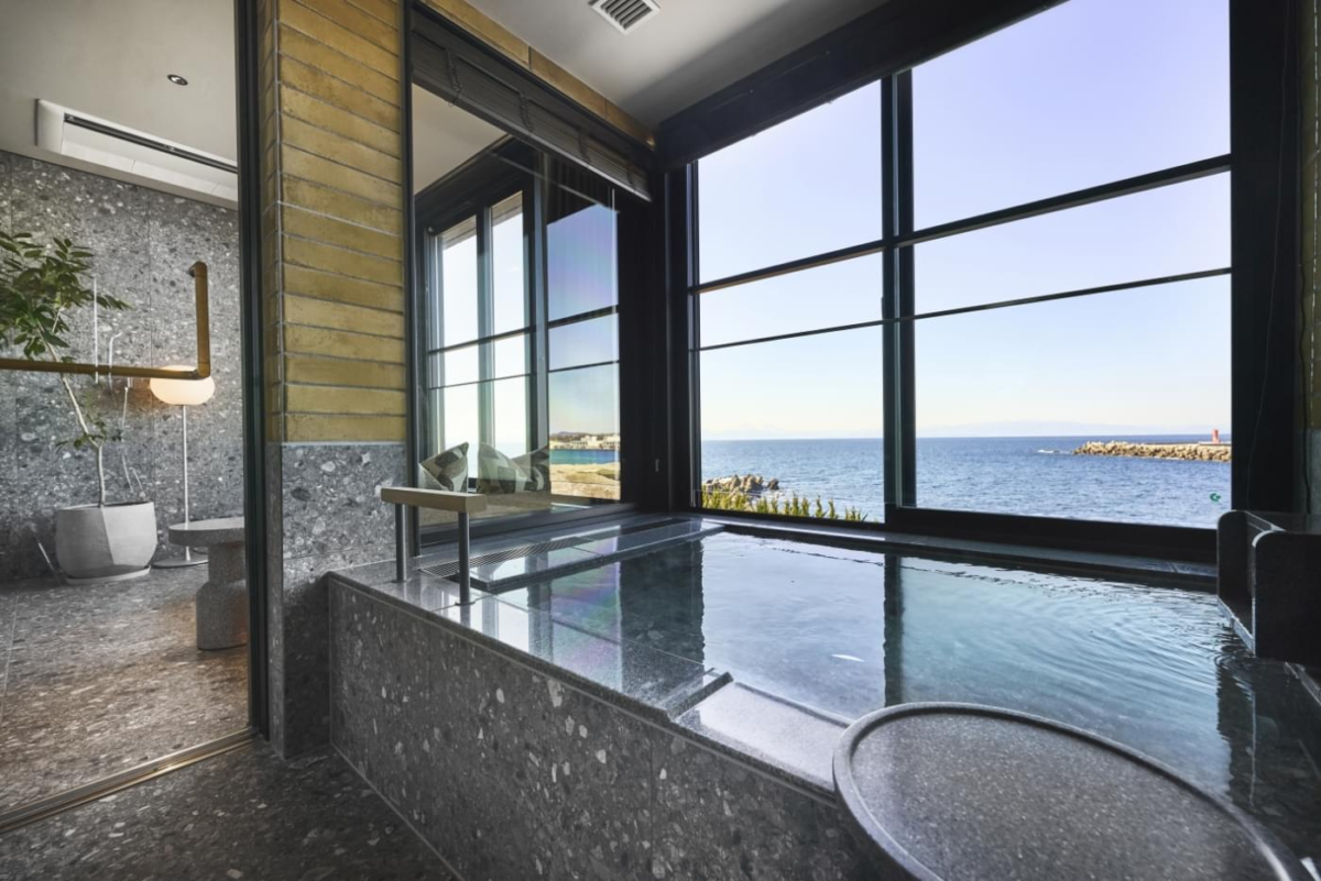 客室は全34室すべてが海を望む配置とされ、各室に天然温泉を完備。湯に浸かりながら、昼は光を反射する海、夕刻は茜色に染まる空と水面、夜は闇と波音を感じる構成です。 - 城ヶ島の自然地形を読み込んだ建築計画