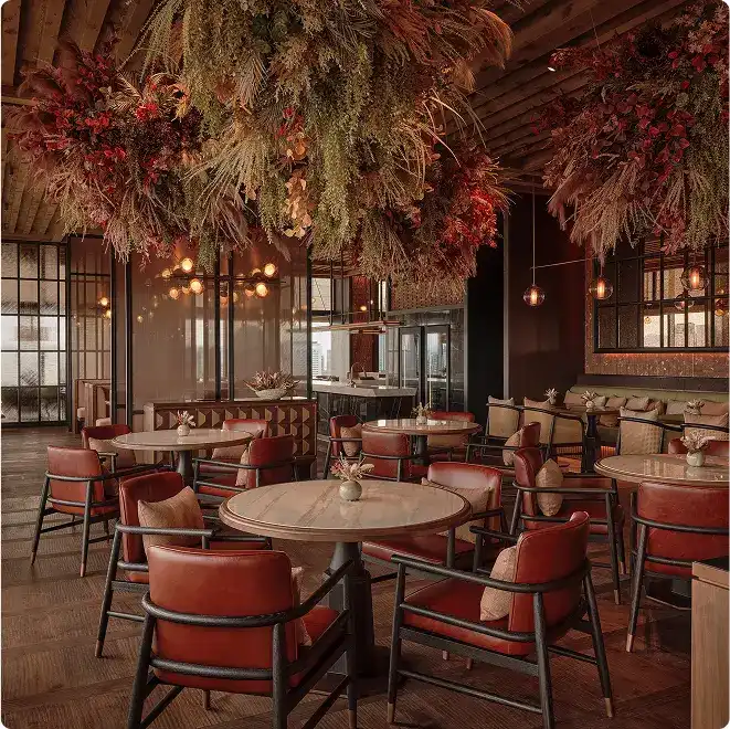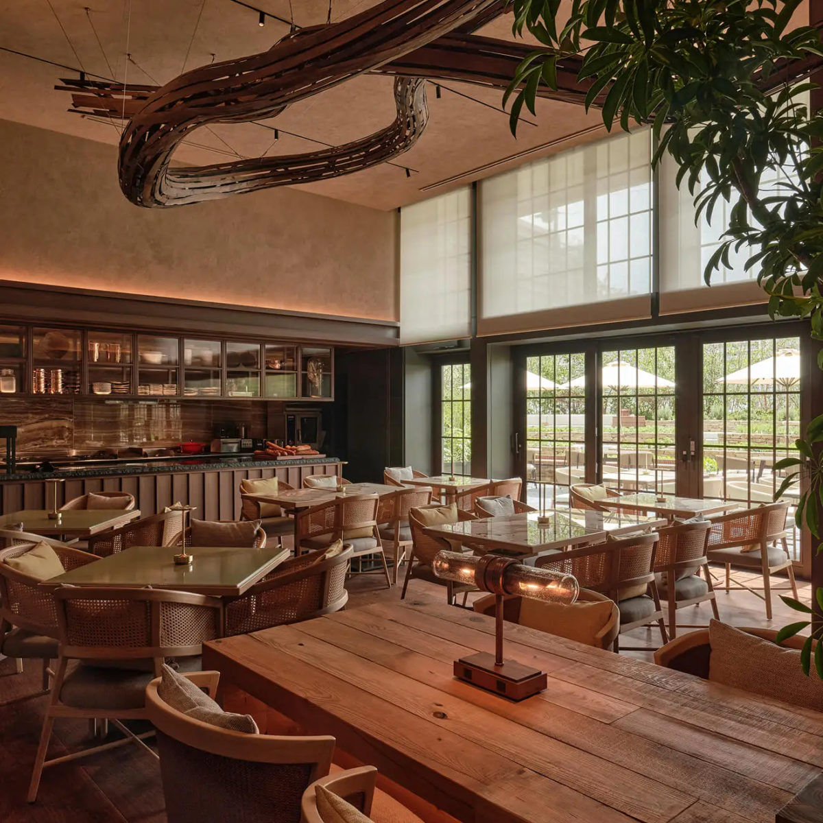館内には個性の異なる4つの飲食業態が揃います。シグネチャーレストラン「P72」は日本の暦・七十二候に寄り添うコンセプトで、地元生産者と連携した旬の料理を提供。店内には大阪の木工工場の廃材から生まれた52メートルの「根」のインスタレーションとハーブ・エディブルフラワーの庭が広がります。
