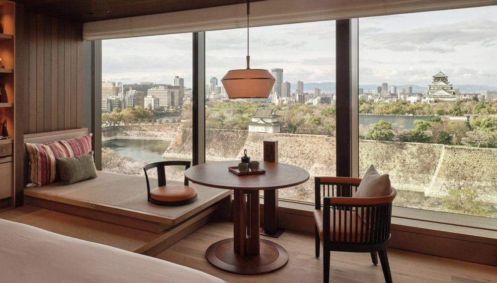 このホテルのデザイン哲学は、日本の美意識「季節感(きせつかん)」です。木・石といった自然素材を基調とした客室は、全221室が50㎡以上という大阪でも最大級の広さを誇り、窓の外には大阪城公園と難波宮跡公園の四季の移ろいが広がります。