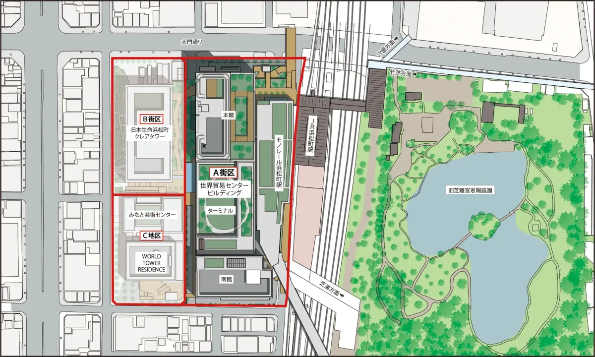 計画地は浜松町エリアに位置し、JR浜松町駅や都営地下鉄大門駅に近接。羽田空港や成田空港へのアクセスにも優れ、国内外のビジネス・観光需要を取り込む国際的な拠点としての役割が期待されています。